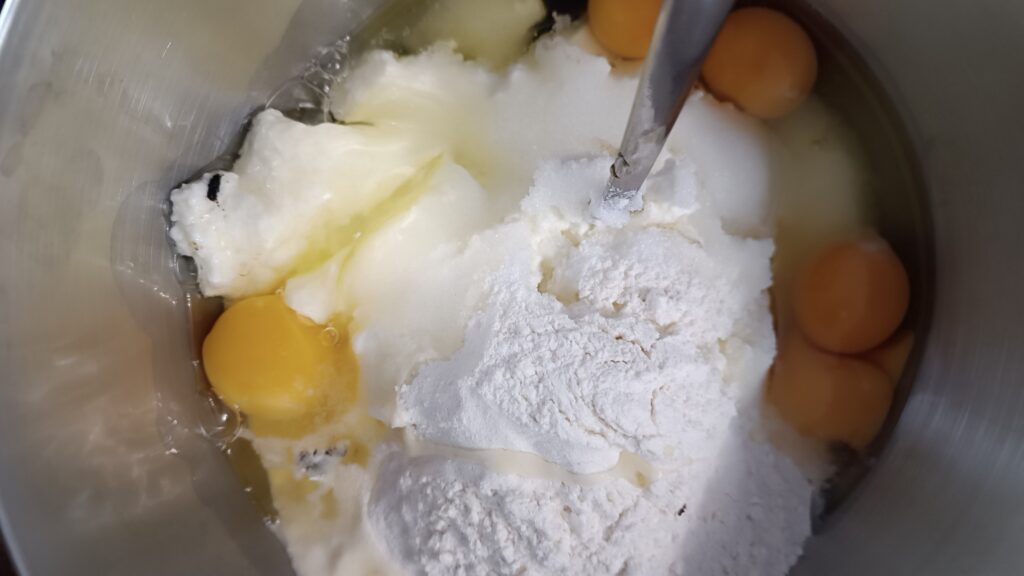 Do misy wrzucamy masę sernikową, maskarpone, erytrytol, mąkę, jaka oraz wanilie.