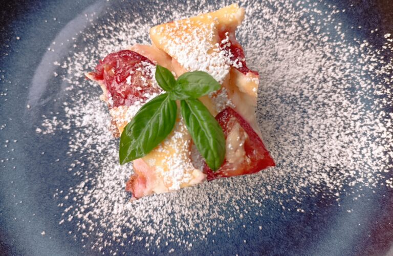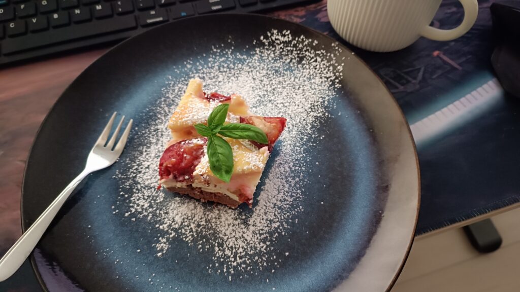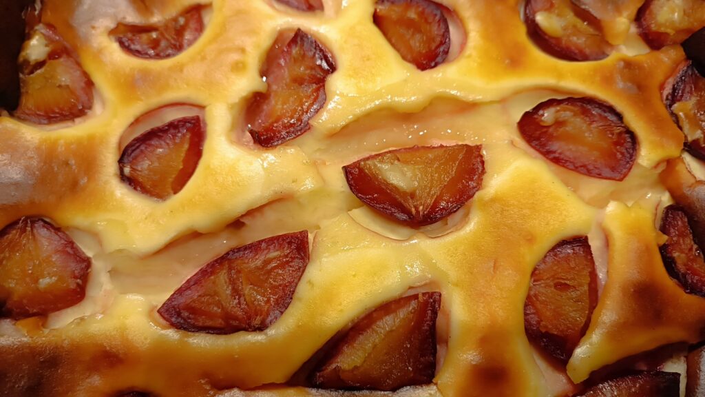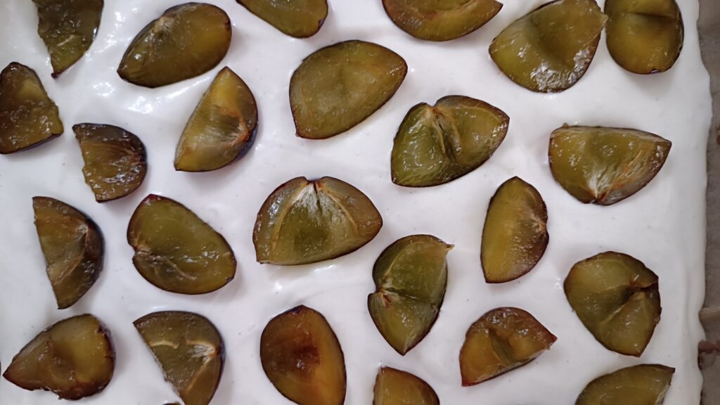 Układamy na wierzch śliwki przekrojone na ćwiartki i wstawiamy do piekarnika.